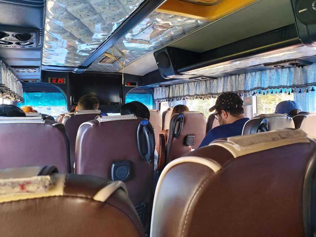 I laughed it off, placed my backpack in the overhead and took a seat at the window in the upper deck. The six seats in the lower area had already been taken, but in the upper story there were a few left – luckily not only in the back of the bus near the restroom.